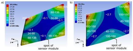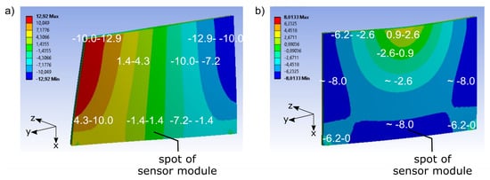 It is interesting how the eigenmodes affect the principal sensing direction of the sensor module. Thus, the deformation in the x-dimension is evaluated. Figure 5 shows the maximum deformation in the x-dimension for each eigenmode. It equally shows that, at the local sensor module, the torsion mode (Figure 5a) manifests itself at comparatively low levels related to other spots of the demonstrator. The bending mode has a noticeable effect, compared to the other spots (Figure 5b). The effects of the deformation are qualitatively similar in the undamaged and damaged model for both eigenmodes. Similar to the undamaged condition, in the damaged condition, the effect at the spot of the sensor module is more significant by the bending mode.