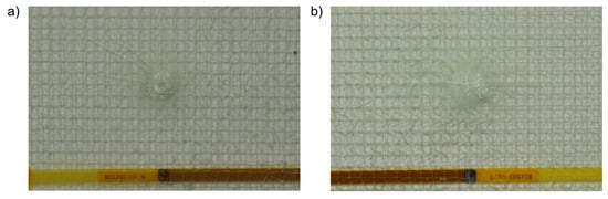 The measurement series are repeatedly done on five test plates. The use of several test plates ensures that the interpretation of the signal analysis is tolerant to structural imperfections, which might occur during the production of composite structures. Due to this, scattering of part quality is common to some extent and might also appear in the target application. For the reference comparison, the test plates will later be impact-damaged in the center of the plate (Figure 3a).