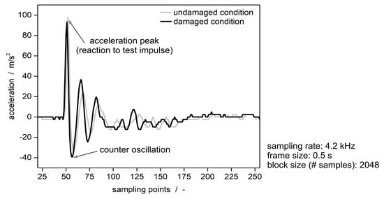 The signal of the sensor device in the time domain nominally returns the applied acceleration of around 100 m/s as a reaction to the test excitation (Figure 7). It has the typical signal characteristics of the acceleration signal of the sensor due to an external excitation. Comparing the demonstrator in undamaged and damaged condition there is no difference between the time signals. The magnitude of the acceleration (ordinate in Figure 7) is identical within the measuring accuracy for both conditions. Also, the cycle time of the first full wave (abscissa in Figure 7) is comparable for both conditions. The other signal wave form shows the typical fading oscillation.