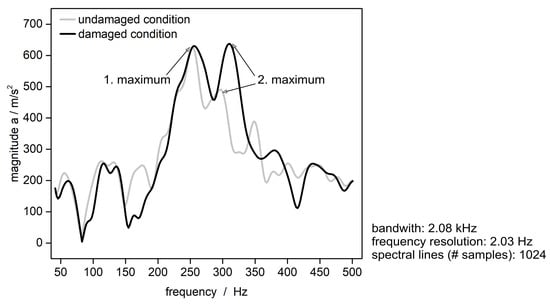 The signal analysis provides other findings. In the frequency domain, the comparison of the acceleration signals shows a clear effect by the damage. The envelope curves of the spectral components of the acceleration signal show the difference respectively before and after the damage (Figure 8).