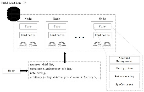 Y-DWMS takes a distributed network as its infrastructure, and each node runs three modules: a ledger module, a core module, and a contract module. In the case that the number of adversarial nodes meets the worst case, , an appropriate consensus protocol guarantees the final consistency of each node state. The system overview is shown in Figure 3.