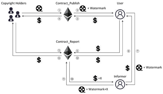 - In order to secure digital rights under the worst condition where an infringer has divulged the copy, a punishment and reward mechanism based on smart contracts is designed to verify watermarks in the divulged copy, authenticate the informer’s report, trace the infringer, perform punishment, reward informers, and recover losses the copyright holders suffered.