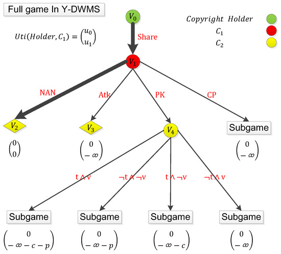 In the full game, the player set contains all users and the copyright holder, i.e., N = {holder, C, C, …, C}. The action set of C is A = {Atk, CP, PK, NAN}, where Atk is a direct attack on Y-DWMS, CP is the divulged copy, PK is divulged public key of C, NAN is nothing to do. The action set of C is A’ = {t ∧ v, ¬ t ∧ v, t ∧¬ v, ¬ t ∧¬ v}, where t is stealing C’s balance, and v is stealing C’s identity. To simplify the analysis, we only discuss the profit of the copyright holder and C, and the matching profit function is u, u. According to the design of contracts, the full game adopts new rules on the basis of a subgame: