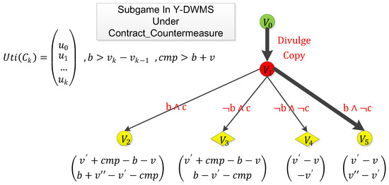 However, in Y-DWMS, informers can counter it simply. As an informer reward request is a secret parameter that the infringer will never correctly predict, this contract cannot know the exact loss the infringer will suffer. The compensation to the infringer must be settled when Contract_Countermeasure is signed, so the informer could simply increase the reward request, making sure that . As a result, the domain decision will switch to , maintaining the original subgame and full game.