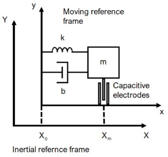 The accelerometer is a spring-mass system attached to a moving reference frame ; is the inertial reference frame. The meaning of m, b, and k is described by Equation (3).