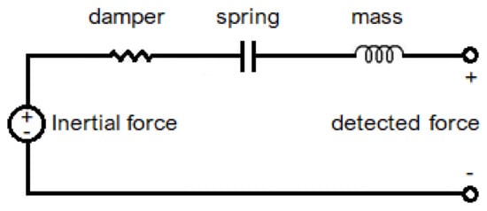 where is the mechanical resonant frequency of the suspended proof mass, and is the damping ratio; the Equation (4) describes the mechanical systems [13]. The analogies with the damping spring mass system can be used to schematize the mechanical system as a resistor capacitor–inductor system; the equivalent circuit diagram is shown in Figure 3.
