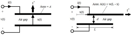 A schematic diagram of a capacitive transducer is shown in Figure 4. On the electrical side, voltage and current are time-dependent; on the mechanical side, electrical force and velocity (where x is the position) are time-dependent. By means of these variables, it is possible to obtain both the electric power and the mechanical power . Assuming the absence of any dissipative effects, it gives . Not all the power is used in the transformation process since part of it is accumulated in the electrostatic form on the capacitor. By assuming a capacitive transducer with an electrically linear response, the capacity is defined as the linear coefficient between electrical charges and voltage :