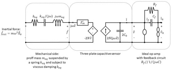 The transfer function of the sensor is calculated as the product of the subsystems’ transfer functions. The equivalent circuit of the whole system is shown in Figure 8.