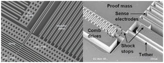 Since 1979, the Stanford University (USA) hosted the first pioneering demonstrations of the use of MEMS accelerometers [3,4], long before they became the extremely popular products they are today. MEMS accelerometers are today used in a multitude of fields and are ideal for large-scale and large-volume applications (e.g., monitoring of machines and vehicles, navigation systems, etc.) [5,6,7,8]. Later, boosted by space exploration necessities, sensors became even more lightweight and sensitive, and suitable also for the requirements of earthquake monitoring [9,10]. The increasing capillarity of their diffusion is literally revolutionizing both the industry and the market. A comprehensive list of the variety of possible applications of MEMS devices is given in [8,11]. Schematically, a MEMS device can be defined as a system capable of sensing the external environment and then convert the measured physical quantities into electrical impulses. Therefore, a MEMS is a system capable of getting information from the external environment converting the measured physical quantities into electrical impulses. MEMS are fabricated directly upon a silicon substrate and can reach the dimension of a few microns. MEMS accelerometers can be classified according to the physical effect used in the sensing mechanism: capacitive, piezoresistive, piezoelectric, electrochemical, optical, thermal, etc. Each method has its own advantages and disadvantages. For example, piezoelectric accelerometers are not suitable for static acceleration, while the capacitive ones are generally more performing and reliable.