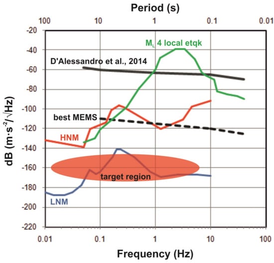 Comparison of the Power Spectral Density (PSD) for some MEMS sensors compared with the seismic noise models (red and blue lines from [37]), and with a spectra response of a local earthquake (green line). The red area indicates the target zone desirable for the next generation of MEMS sensors. Figure from [12].