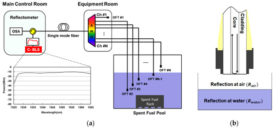 Generally, the water level in the SFP is measured with an ultrasonic level meter. This level meter provides the advantages of simplicity and continuous level measurements. However, there are some limitations, due to its limited measurable distance and low resistance to electromagnetic interference (EMI). Moreover, it is not easy to operate the level meter during a loss of power accident. To overcome these limitations, there have been several approaches to apply an optical fiber sensor (OFS) to nuclear facilities, due to its advantages such as passive sensing capability, remote transmission, EMI-tolerance, radiation-resistance and redundancy [5,6,7,8]. Specifically, many studies have been done with the various types of optical sensing techniques to monitor important physical parameters under harsh environments such as neutron and gamma radiation [8,9,10,11,12]. For the water level measurement, there have been reported a number of quasi-distributed optical fiber sensors based on several multiplexed sensing techniques [6,7,13,14,15,16,17,18]. The multiplexing schemes are divided into two categories according to the sensor types: (1) discrete level sensors with an optical coupler, or (2) special fiber sensors that embedded several discrete level sensors on a single fiber. One of the simple multiplexing methods is utilizing the time division multiplexing (TDM) technique based an optical time domain reflectometer (OTDR) with an optical coupler [6,7,13]. It can be implemented easily with commercially available optical components, but this method suffers from the high insertion loss of the coupler to enhance the spatial resolution of the water level. Another simple method is employing a specially fabricated single fiber sensor with multiple discrete level sensing functions. For this purpose, several options have been proposed, such as arrayed fiber Bragg grating (FBG) sensors embedded in silicone rubber [14], optically heated FBG arrays [15], a plastic optical fiber with laterally polished bent sections [16] or engraved grooves [17], a single mode fiber with uniformly spaced multiple gaps [18], and so on. However, this method still suffers from the limited measurement points resulting from the fabrication process. In addition, some of the proposed sensors require previously measured reference information such as wavelength [14,15], or received power [16,17], or signal processing for cross-correlation [18].