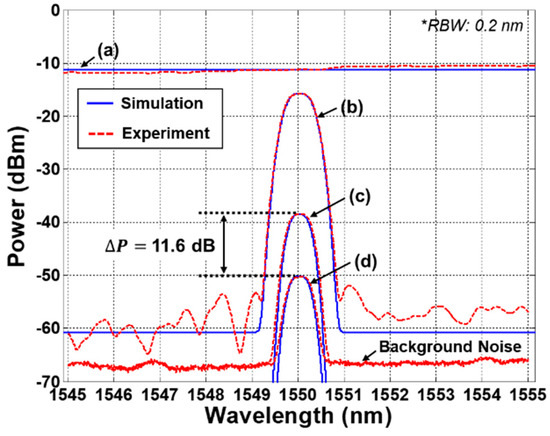 The measured optical spectra of channel #6 were shown in Figure 2 with the simulation results. The optical spectra of (a) and (b) represent the ASE lights before and after spectrum-slicing by the AWG. The insertion loss of the AWG was 4.5 dB. The spectra of (c) and (d) show the received ASE lights after reflection at the air and the water, respectively. The measured peak power of the spectrum-sliced ASE reflected at the air and the water was about −38.5 dBm/0.2 nm and −50.1 dBm/0.2 nm, respectively. The peak power difference between two optical spectra was about 11.6 dB. These experimental results are well matched with the simulation results. It should be noted that the rest of the AWG channels were terminated with optical terminators to prevent the reflection of the unwanted ASE lights except the channel #6. As shown in Figure 2, the measured background power due to the reflection of the optical connectors was about −67.5 dBm/0.2 nm (including the 1.5 dB insertion loss of the optical circulator), which acted as background noise [31,32,33].
