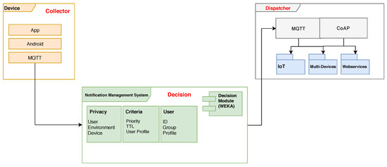 The proposed system receives the notifications from different external sources and stores them in the first module (Collector). The information present in the notifications regarding the criteria and the privacy are the exclusive domain of the decision module. The collection has a buffer function, temporarily storing the data while being moved and processed by the decision module.