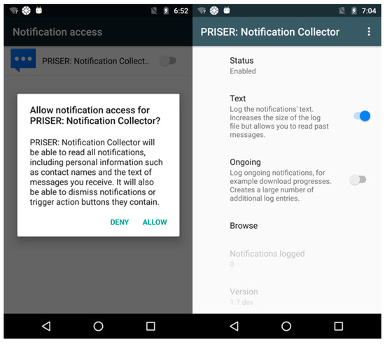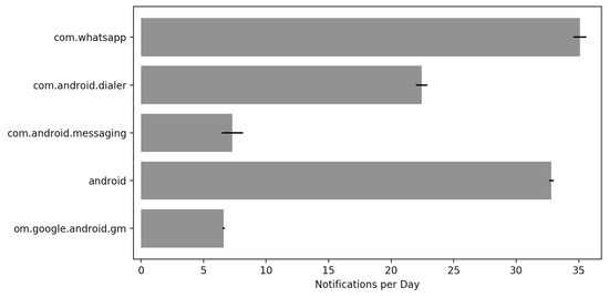 - Weber, D.; Voit, A.; Henze, N. Notification Log: An Open-Source Framework for Notification Research on Mobile Devices. In Proceedings of the 2018 ACM International Joint Conference and 2018 International Symposium on Pervasive and Ubiquitous Computing and Wearable Computers, Singapore, 8–12 October 2018; pp. 1271–1278. [Google Scholar] [CrossRef]