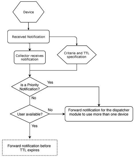 The notifications are then sent to the second module, whose primary function is to make decisions, receiving information related to the privacy of the environment, device, or even the user. It is also receiving criteria information in the context of the user (e.g., location, status, current activity) as well as information relevant to the notification such as lifetime. The criteria has important functions in the NMS and a flow chart represent this in Figure 4. The information is used to choose the best devices and the best forms (e.g., vibration, sound or light) to display the received notifications.
