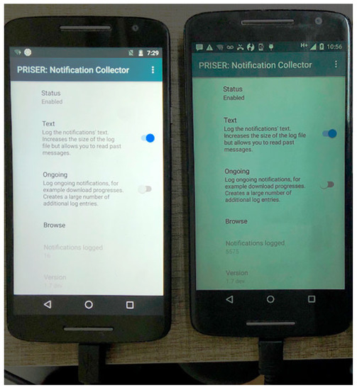 Given this, the PRISER Notification Collector application was implemented and used for the initial experiments. In these experiments, two smartphone devices with an Android operating system were used. The application proposes that the user also can send text messages and receive texts on their device, and respond to messages from various messaging applications between all devices connected to the application. The application remains in the background and collects various system notifications, messages, and even links. The events usually appear in the notification panel, as shown in Figure 6.