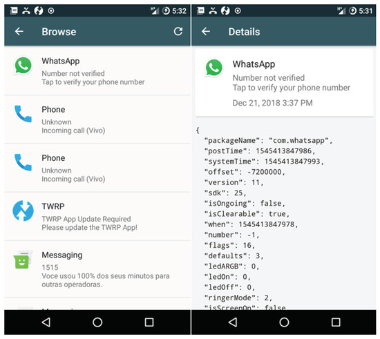Notifications are stored in devices’ memory and can be navigated by the device administrator. A JSON object composed of all notification information is obtained according to the items mentioned above. This can be seen in the image as presented in Figure 7.