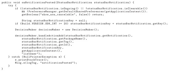 The application initially obtains the notifications. This stage of the process integrates the collector module, which makes the sharing with the decision module, the second stage of this work. The onNotificationPosted method plays an important role in NMS, depending on the other methods to execute. This method is showed in Figure 9.
