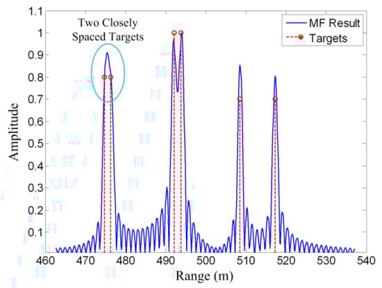 Figure 2 shows an example of the matched filtering method. Six point targets are set in the scene. It can be seen that the matched filtering result is the convolution of the targets and the autocorrelation of the system response. As a result, an idea point target is spread into a sinc waveform. Consequently, targets will interfere with each other, and two closely spaced targets may not be resolved in the matched filtering result.