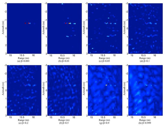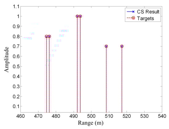 If is sparse and satisfies some specific conditions, Equations (18) and (17) will have the same solution, and this solution is the exact or approximate recovery of [,]. Equation (18) can be solved using convex programming, which is more tractable than the original -norm minimum problem. Unlike the matched filtering method, CS method does not have an exact or pre-defined resolution, since it is a non-linear method. Generally, the resolution capability of the CS method is much better than the matched filtering method if the targets are sparse.