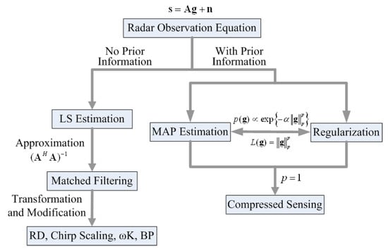 Figure 4 shows the block diagram and the relationship of the radar imaging methods. All of the radar imaging methods can be divided into two branches. The first branch does not use the prior information of the targets or scene, and it leads to the linear imaging methods; the most typical and widely used one in this branch is matched filtering. Another branch uses the prior information of the targets or scene. This leads to the non-linear methods. The most recently developed methods, including regularization methods, Bayesian methods, and CS methods belong to this branch.