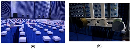 Experimental scene for CS-based stepped frequency radar imaging. (a) Five reflectors in the microwave chamber. (b) Transmitter and receiver antennas.