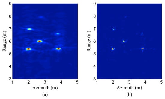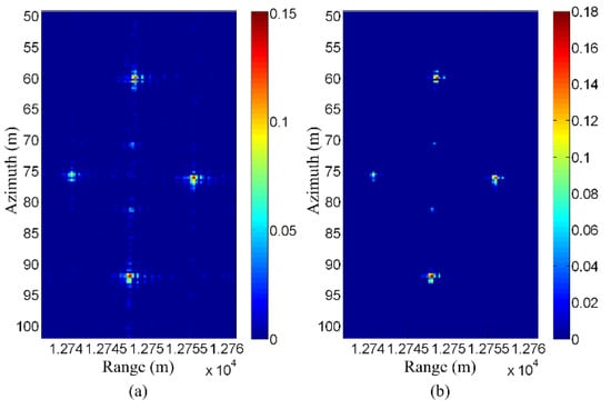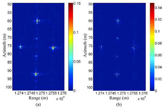 Figure 16a shows the original CS reconstruction result. Since the observation position errors are not compensated, it can be seen that the targets are somewhat defocused. Figure 16b shows the corresponding CS reconstruction result with compensation for observation position error. It can be seen that the focusing quality is improved using the method proposed in []. The peak of the targets has an increase of about 20%, and the sidelobes are also significantly reduced.