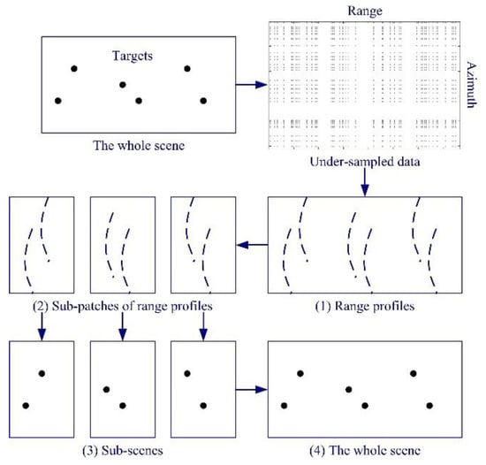 A common idea for reducing computational complexity and memory occupancy is to split big data into sets of small data []. Based on this thought, a segmented reconstruction method for CS based SAR imaging has been proposed []. In this method, the whole scene is split into a set of small subscenes. Since the computational complexity is non-linear to the data size, the reconstruction time can be reduced significantly. The sensing matrices for the method proposed in [] are much smaller than those for the conventional method. Therefore, the method also needs much less memory. Due to the short reconstruction time and lower memory requirement of the method proposed in [], reconstructing a moderate-size scene in a short time is no longer a difficult task. The processing steps of the segmented reconstruction method are shown in Figure 7.