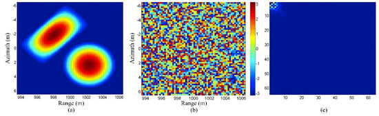 Equation (7) can be viewed as multiplying the best estimate of the scene with . The matrix is the autocorrelation of the system response, which usually has a sinc pulse shape [,]. The matched filtering result can be viewed as the convolution of the best estimate of the scene and the sinc function. A point target will be spread, and side-lobes will also appear in the matched filtering result []. This implies that the matched filtering method can only provide an image that blurs the details of the scene. The matched filtering method has a limited resolution, which depends on the autocorrelation of the system response [].