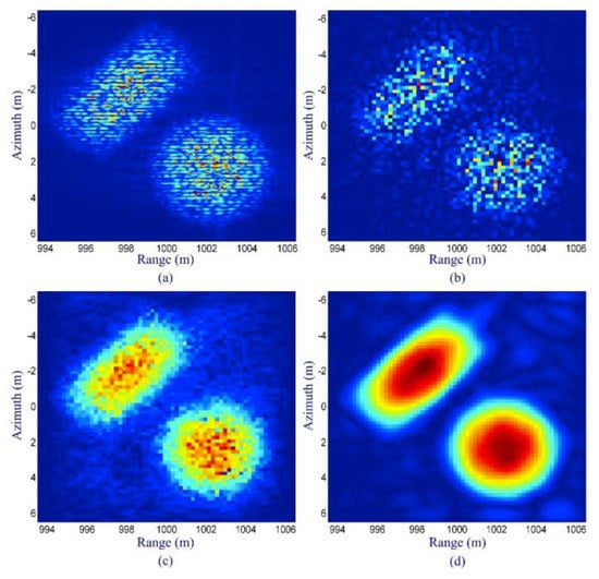 Simulation results: (a) matched filtering result, (b) conventional CS reconstruction result without sparse representation, (c) result of the method with magnitude sparse representation, and (d) result of the method with improved magnitude sparse representation (taken from []).