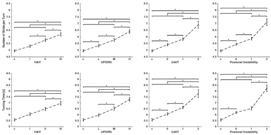 As the disease progresses, gait impairment associated with deteriorated mobility becomes more prevalent. In this section, we examined whether spatio-temporal parameters that characterize turning were able to reflect gait impairments.