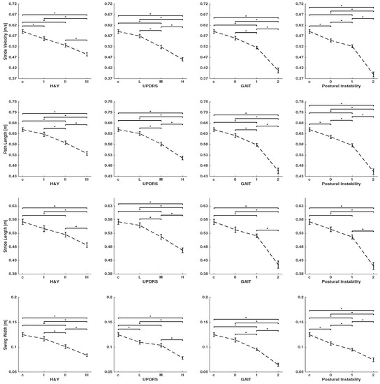 As the disease progresses, stride velocity, path length, stride length, and swing width (per-stride parameters) decreases, and as a result, patients need more strides and time (global parameters) to complete a turn. This can be observed for all clinical scores, although the two sub-items of gait and postural instability are showing larger differences between stages of the disease. Stride time shows no clear change between different groups.