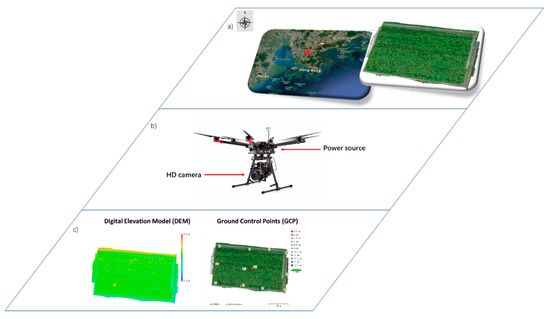 (a) Location of experimental plot, (b) unmanned aerial vehicle platform, and (c) ground control points, and ground control points in acquired data.