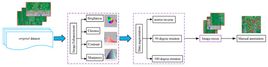 The high-quality UAV-based images were used to construct an original dataset, which is a key contribution of this study. We then divided the image preprocessing pipeline into four main steps: First, the image-enhancement process was used to eliminate the effect caused by shadow and variable illumination and to remove the background. Next, the downscale images were used to adapt the DL model and improve training efficiency. We then added annotations to each image denoting the bounding boxes of the panicles. Finally, we used data-augmentation techniques to artificially enlarge the number of training images [13] (Figure 2).