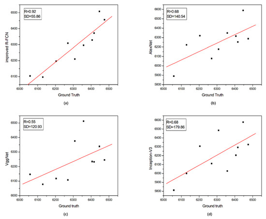 Ground truth versus estimated number of panicles per plot. (a) represents the correlation between the ground truth and improved R-FCN, (b) represents the correlation between the ground truth and AlexNet, (c) represents the correlation between the ground truth and VggNet and (d) represents the correlation between the ground truth and Inception-V3. The vertical axis refers to the number of panicles estimated by the proposed approach and the horizontal axis refers to the number of panicles that have been manually counted.