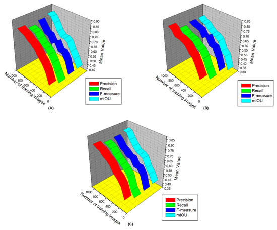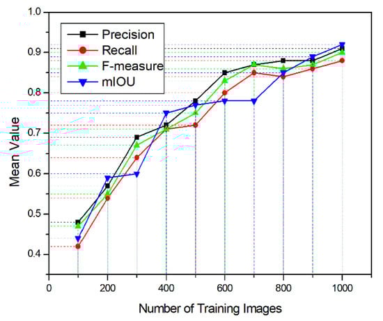 Figure 5 shows the relationship between evaluation index and the number of training images. We see from Figure 5 that the index rises quickly with a small number of training images. For example, when the accuracy reaches a relatively high value (about 0.85), performance is close to convergence for all models, only increasing by 0.05 to 0.07 after introducing the remaining training images (Figure 5).