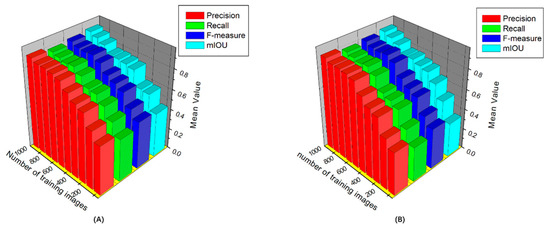 Detection performance with and without transfer learning for different numbers of trainings: (A) with transfer learning, (B) without transfer learning.