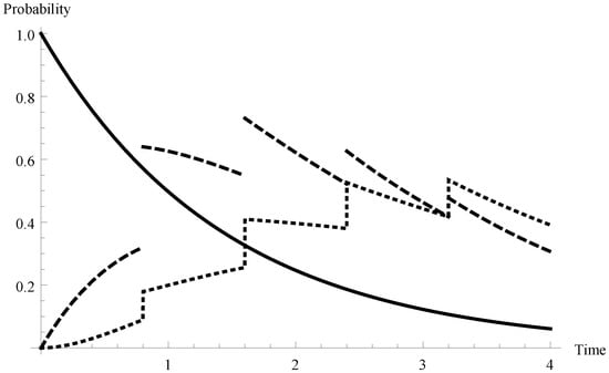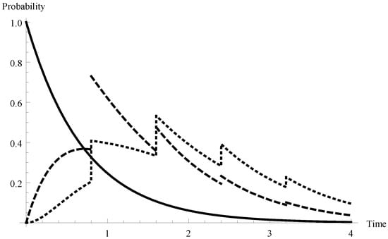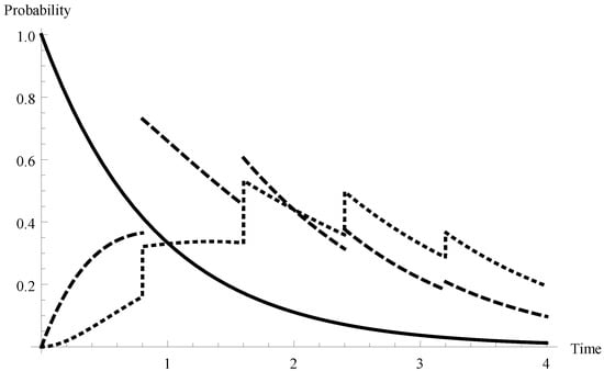Hence the mean service time of a single packet equals 0.875 and, in consequence, the offered load for the system is . Let us fix ,  and . In Figure 1 the queue-size distributions  for  (solid line),  (dashed line) and 2 (dotted line) are visualized. As one can observe, for  the graphs have characteristic shapes in which the character of the function changes every 0.8 time unit. Obviously, it is connected with the fixed duration of a single server vacation equal to 0.8.