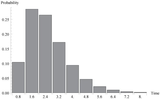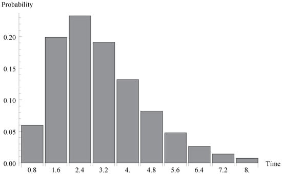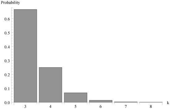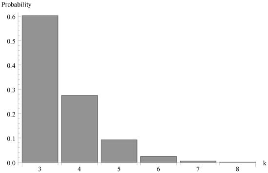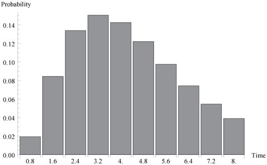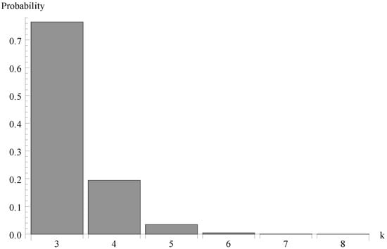 We investigate now the behaviour of the probability distribution of the idle period duration. Evidently, this time is a certain multiple of the single vacation duration . In Figure 4, Figure 5 and Figure 6, respectively, the cases of , 0.7 and  are presented. As it can be observed, the greater arrival intensity, the greater probability that the idle period will finish after one server vacation only (at time ). Moreover, let us note that (except for the case of one single vacation case) the maximum of the distribution moves to the right with the decrease of  (or with the decrease of the offered load).