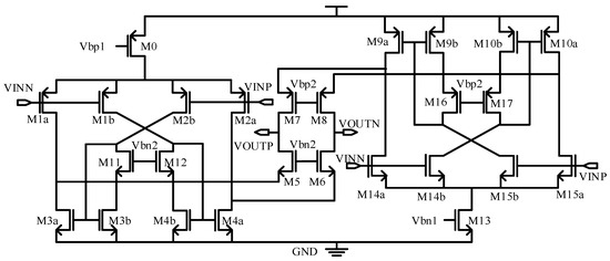 The amplifier in this C–V conversion circuit adopts the complementary recycling folded cascode (CRFC) architecture [23] due to its larger gain-bandwidth-product (GBW) and slew rate compared with conventional folded cascode op-amp as shown in Figure 4. It has NMOS and PMOS transistors as complementary input differential pairs, and in both branches, the recycling folded cascode (RFC) technique [24] is introduced to achieve more biasing current efficiency. The CRFC amplifier improves its GBW by a factor of 1/3 compared with the RFC under the same biasing current and capacitive load.