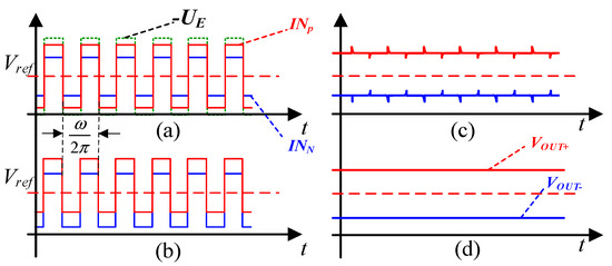 Diagram of the synchronous switch demodulation method: (a) two signals after the C–V conversion module and switching signal; (b) output signal of INP and INN after the switch demodulated; (c) Signals after differential; and (d) the differential signal is output after filtering.