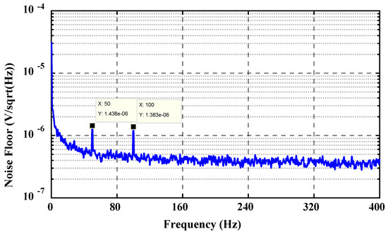 Next, the noise of the circuit was tested. The output noise of the interface circuit was tested with 35670A produced by Agilent Technologies Inc. The noise spectrum of the output voltage is shown in Figure 8. The floor for the output voltage noise of the signal was 400 nV. The points marked in the figure indicate a power frequency interference of 50 Hz. This would have a strong influence and needs to be reduced by careful shielding during operation. In addition, the noise also exhibits a strong 1/f characteristic, mainly due to the low-pass filter after switching demodulation.
