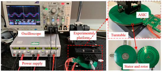 The analog interface circuit was connected with the sensitive structure for further testing. Figure 9 shows the experimental setup for testing the characteristics of the encoder. The setup consisted of a high-precision turntable and sensor mounting system. For the sensor installation, the gap was mainly controlled by the feeler gauge to ensure clearance and concentricity. The gap between the stator and rotor was 0.3–0.5 mm. The concentricity was determined by marks at the edges of the rotor and stator to achieve alignment. As shown in the figure, the device mainly consisted of two parts: the fixed system of the rotor and stator, which needed five degrees of freedom to achieve the above adjustment of the eccentricity and tilt; and a miniature precision turntable purchased from Physik Instrumente Corporation. The diameter of the turntable was 23 mm, and the position accuracy was 0.005°. The stator and the rotor plates, both of which are fabricated by advanced PCB technology with the diameter of 54 mm.