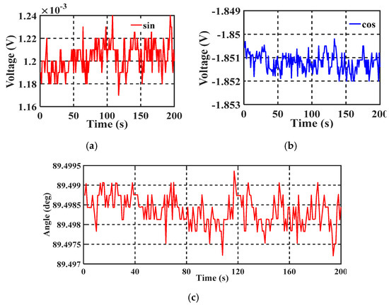 The long-term stability of the encoder was tested. Keithley 2010 was used to collect the output voltage data, which were then saved and processed with a computer. Figure 10a,b show the long-term voltage stability of two orthogonal signals. The voltage variation of the two signals did not exceed 2 mV. The demodulated angle is shown in Figure 10c, and the fluctuation did not exceed 0.002°. The main cause of the fluctuation in the long-term stability test was the environmental impact, especially the vibration acting on the sensitive structure.