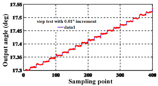 In order to verify the sensitivity of the ASIC and sensitive structure, the step size was tested. To determine the resolution of the proposed encoder, a step test with an increment of 0.01° and delay of 2.5 s was performed. The corresponding output angle response is shown in Figure 11. The resolution of the proposed angle sensor was considerably better than 0.01°; thus, it meets most application requirements.