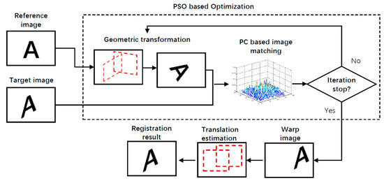 Pipeline of the proposed image registration which combine phase correlation and particle swarm optimization.