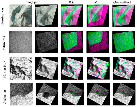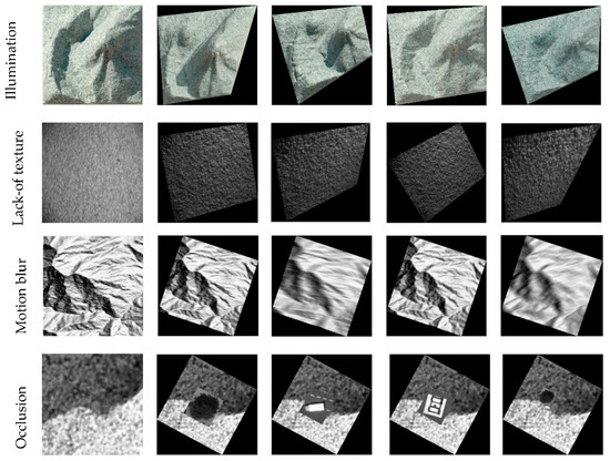 Image registration tasks are carried out using image pairs which contain challenges including illumination variation, lack of texture, motion blur, occlusion and different geometric distortions, as shown in Figure 3. For the illumination image pairs, 10 images from the same position are taken from 9:30 to 15:30 on a terrain model under daily sunlight variation, and then the image taken in 10:30 is used as target image, and the remaining nine images are warped by perspective transformation and use as reference image, as shown in the first row in Figure 3. The lack-of texture dataset is downloaded from the webpage of TextureLab at Heriot-Watt University. This dataset includes images from different texture surfaces. The light source in this dataset is a fixed desk-lamp (+12 V, max 0.45 A) and a Vosskuhler CCD 1300LN digital camera is used to take images. Here we selected 10 pairs of textureless image pairs, and performed perspective transformation on the reference image, which are shown in the second row of Figure 4.