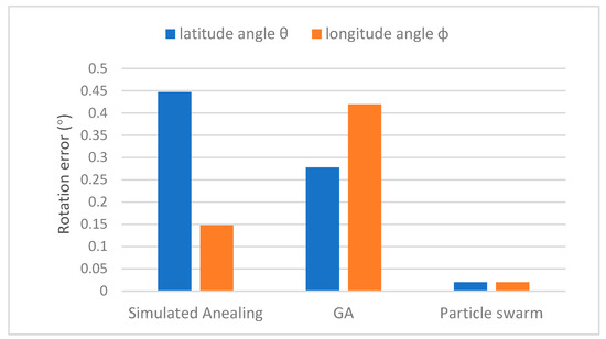 The empirical optimization settings are shown in Table 2, where several parameters in common are the same for the three optimization methods for fair comparison. The maximum iteration and function tolerance are parameters to stop the iteration. A large maximum iteration and small function tolerance indicate strict constraint for optimization, which means more accurate result with more iterations. To balance the precision and speed of optimization, in this paper, maximum iteration and function tolerance are set as 10,000 and . The low and upper bounds are minimum and maximum values of the estimated angles. In this paper, as the ground truth values of latitude and longitude angles range from 0° to 30°, the low and upper bounds are set as 0 and 50. The number of swarm/chromosomes in PSO and GA is set as 15. A large swarm size value can avoid the optimization from falling into as local optimum, but will certainly increase the time required for optimization. For Simulated Annealing, the initial temperature is set as 5000 and a slow cooling factor 0.95 is set to allow the temperature to go down slowly at first but ultimately get cooler faster until converge to the optimal solution. For PSO, the inertial weighting factor is set as 0.729 under Clerc’s constriction factor [35], while both self confidence factor and swarm confidence factor are set to 1.49, also according to Clerc’s constriction factor. Setting and equal can avoid the optimization stuck in current optima. The rotation transformation errors calculated from three optimization approaches are shown in Figure 4.