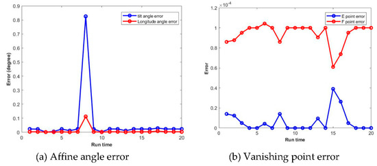 Matching error with respect to affine angle and vanishing point variations in 20 runs. (a) Affine angle error. (b) Vanishing point error.