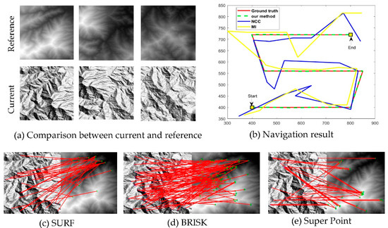 DEM referenced image-based navigation. (a) shows the input current and reference images, (b) shows the navigation results of proposed methods in comparison with NCC and MI, (c,d,f) demonstrate the image matching results of SURF, BRISK and Super Point respectively.